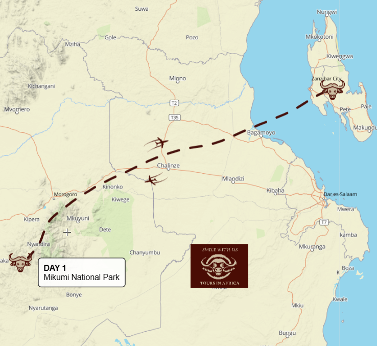 Mikumi National Park is a relative small park and so it’s easy for you to have a wonderful game within few hours. The day will start with the hotel transfer to Zanzibar airport and later to fly at 07hr00 to Mikumi National Park for the game drive. Welcome!
